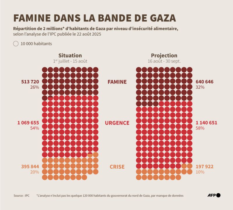 Selon une analyse du Cadre intégré de classification de la sécurité alimentaire (IPC) publiée fin août, plus d’un demi-million de personnes sont en proie à la famine à Gaza, 1,07 million de personnes supplémentaires (54%) sont en situation d'urgence et 396.000 personnes (20%) sont en situation de crise.