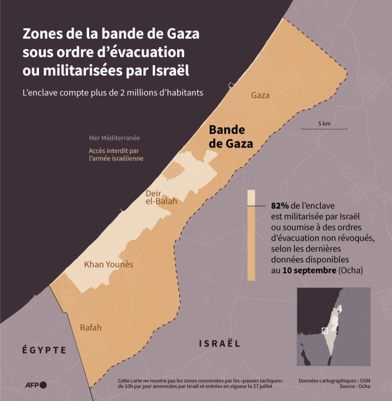 L’armée israélienne contrôle actuellement 82% de l’enclave selon des données du bureau des Nations unies pour les affaires humanitaires (Ocha). Israël a intensifié ses opérations au sol en plus des bombardements aériens, avec pour objectif de contrôler le territoire et d’y maintenir une présence permanente, au lieu de mener des raids rapides. En août, elle a approuvé une opération visant à s'emparer de la ville septentrionale de Gaza et de camps de réfugiés du centre qu’elle considère comme les derniers bastions du Hamas.