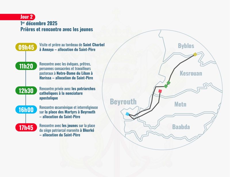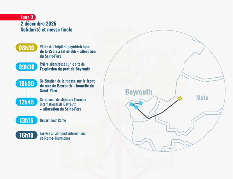 Une visite à l’hôpital psychiatrique de la Croix à Jal el-Dib, ainsi qu’une prière silencieuse sur le site de l’explosion du port de Beyrouth, marqueront la dimension sociale et médicale du déplacement. La visite s’achèvera par une célébration de la messe sur le front de mer de Beyrouth, puis de la cérémonie officielle d’adieu à l’aéroport.