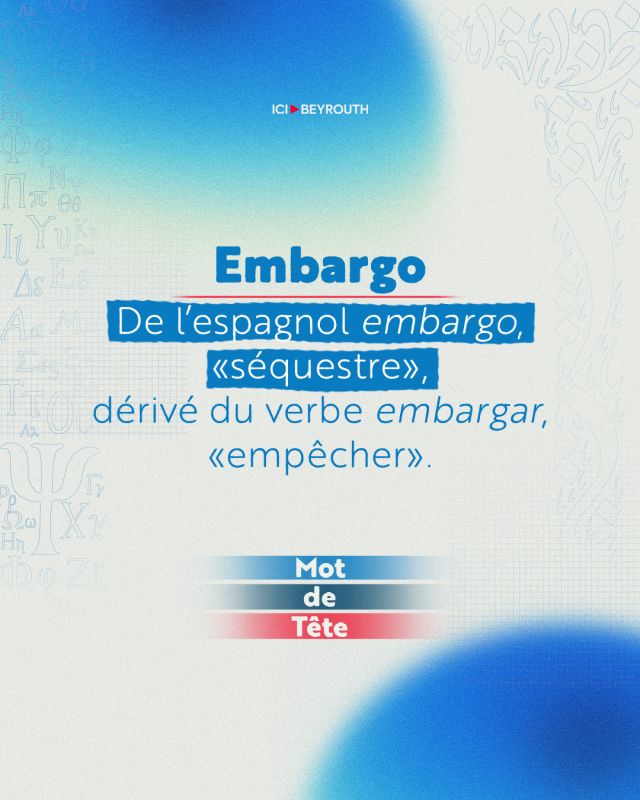 Le mot «embargo» entre en français au XVIIᵉ siècle. Il est emprunté à l’espagnol embargo, signifiant «empêchement, obstacle, séquestre», lui-même dérivé du verbe embargar, «empêcher, entraver». Ce verbe est apparenté au latin vulgaire imbarricare, formé sur barra, «barre».