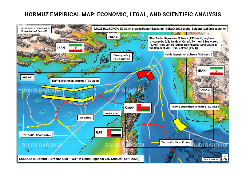 Quant à la partie occidentale du détroit, là où il s’ouvre sur le Golfe, elle comprend également des voies de navigation soumises à un régime obligatoire, situées en partie dans des eaux que l’Iran revendique comme siennes, et en partie dans des zones contestées avec les Émirats arabes unis, conformément à l’accord sur le plateau continental de 1974.