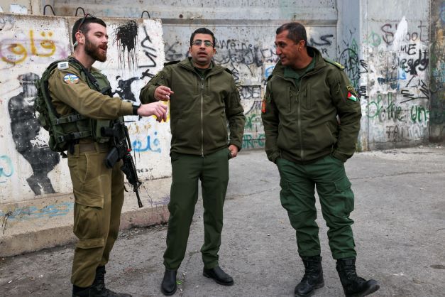 Rare (et bizarre) moment d'amitié entre des policiers palestiniens et un soldat israélien au point de passage entre la Cisjordanie occupée et Israël le plus proche de Bethléem.