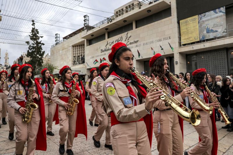 Le défilé de la fanfare des scouts palestiniens.Maintenant que les restrictions sont levées dans les Territoires palestiniens et en Israël, où est situé l'aéroport international le plus proche de Bethléem, la ville palestinienne reprend des airs de fêtes.