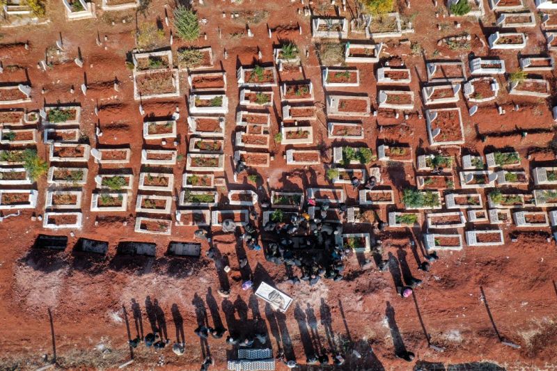 Des personnes en deuil enterrent les victimes d'un bombardement nocturne sur la ville d'Azaz dans la province syrienne d'Alep. (AFP)L'année dernière, l'Observatoire avait dans un premier temps présenté le bilan de 3.746 morts en 2021 comme le plus bas de la guerre avant de l'actualiser à 3.882. Après des années de combats et bombardements meurtriers et dévastateurs consécutifs à la brutale répression par le régime de manifestations anti-gouvernementales en 2011, les affrontements ont quasiment cessé ces trois dernières années.