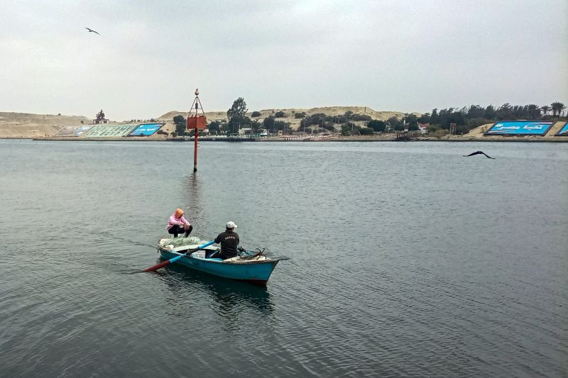 Très stratégique, le Canal de Suez est prisé des navires commerciaux... et des pêcheurs locaux. 9 janvier 2023 (AFP)En mars 2021, l'Ever Given, un porte-conteneurs géant de presque 200.000 tonnes dont la proue s'est encastrée dans la rive est du canal pendant une tempête de sable, avait bloqué pendant plusieurs jours la voie de circulation entre l'Europe et l'Asie.