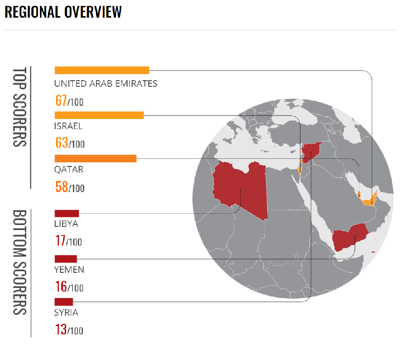 Parmi les pays arabes, les Émirats Arabes Unis et le Qatar ont obtenu les meilleurs scores, tandis que la Libye, la Syrie et le Yémen, englués dans une guerre civile meurtrière, occupent les trois dernières places. Les performances des pays du Golfe, qui occupent le haut du palmarès arabe, sont en déclin par rapport à 2021, en raison de "l'intensification de la répression sur l'espace public et l'hyper-nationalisme promu par les autorités".