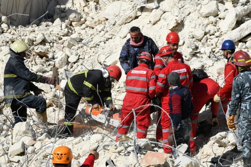 Des sauveteurs iraniens (en rouge) passent au crible les décombres d'un immeuble effondré dans la ville d'Alep, dans le nord du pays, à la recherche de victimes et de survivants, le 9 février 2023. (Photo AFP)Ceux qui n'ont pas cherché refuge dans les camps se sont dirigés vers les dizaines de centres d'accueil ouverts par les autorités locales.